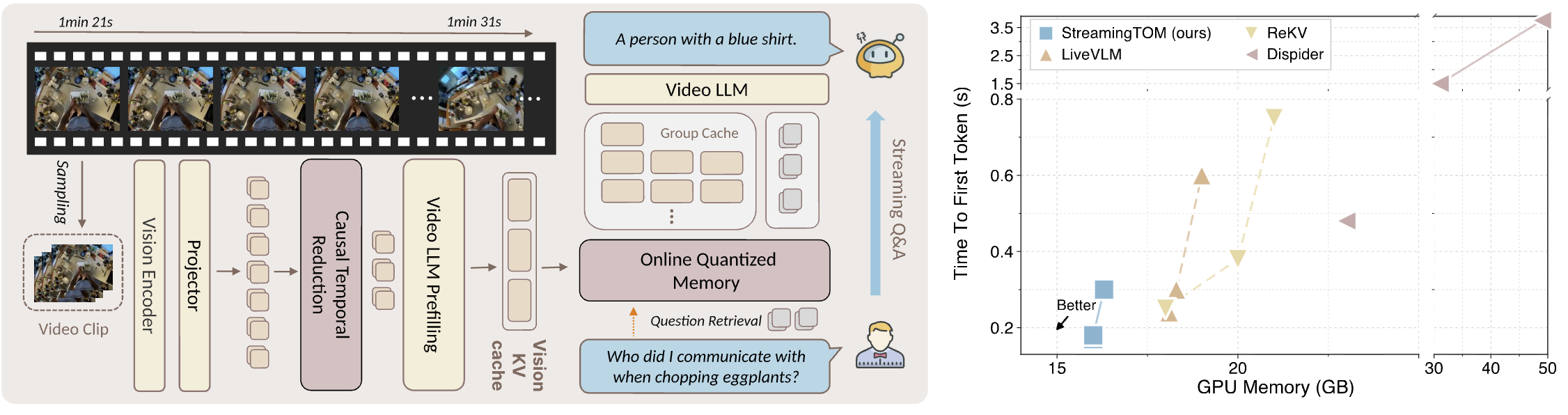 StreamingTOM Architecture: The framework consists of two coordinated pipelines. The vision pipeline encodes each frame and applies Causal Temporal Reduction to condense redundant tokens into compact groups, which are written to an online memory for reuse. The query pipeline processes questions and drives the decoder to interact with the memory through Online Quantized Memory, which stores groups at 4-bit precision, retrieves at most k groups on demand, and dequantizes them for efficient generation.